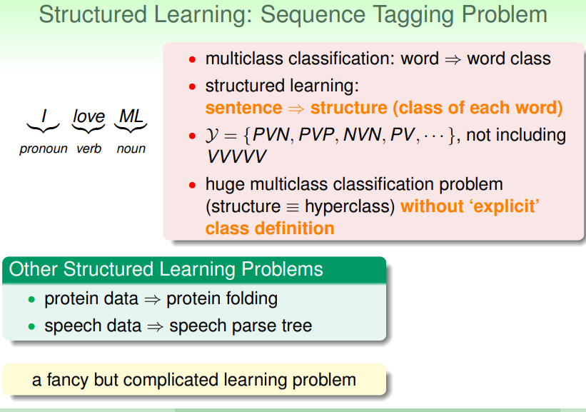 - 和多分类问题简单地给出词性不同,结构化学习需要根据语境给出合理的词性判断,而不同的句子中同一单词的词性是可能不同的,因此问题更复杂——没有确定的分类标准;