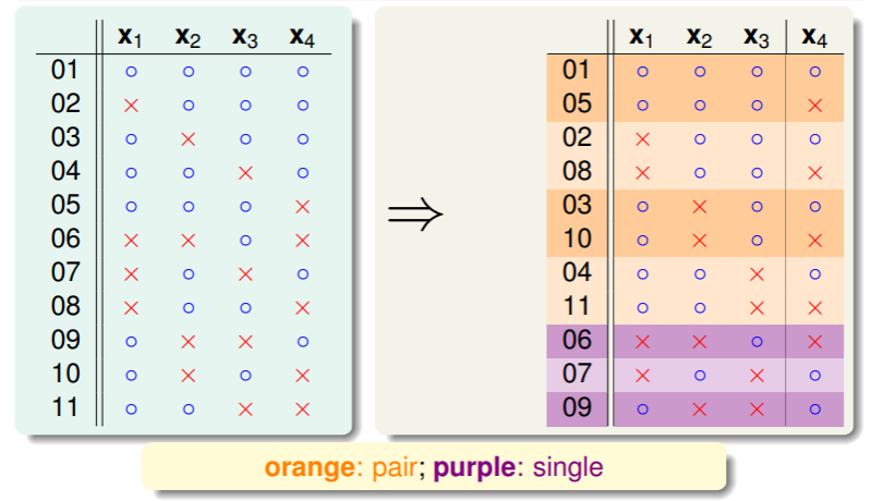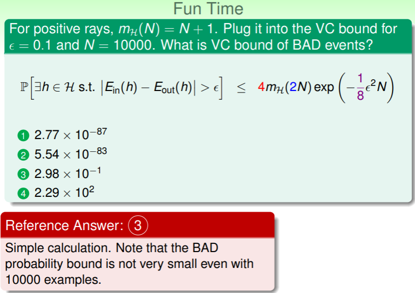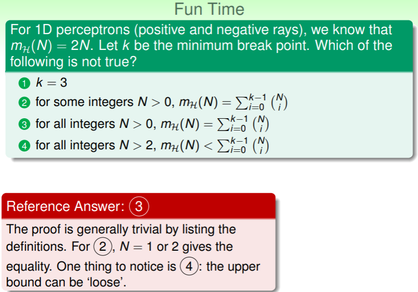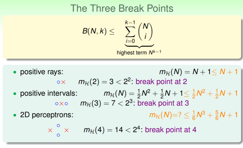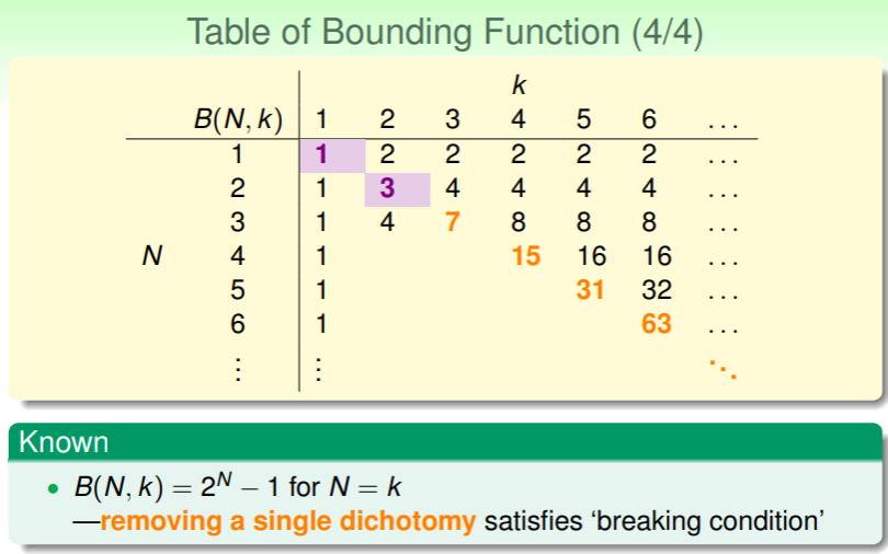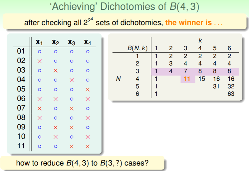 - 注意这里 dichotomies set 的数量为 ,是怎么算出来的呢?一个 dichotomy 中有 4 个元素,故有 种 dichotomy,而 dichotomies set 是指 dichotomy 有几种选择方法,故总共 种;