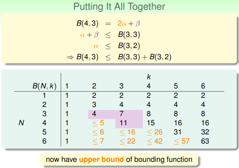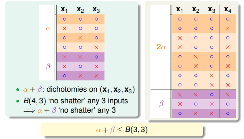 从而 又缩小为 3 个输入中不能被 2 个长度的子向量 shatter 的问题,即 ; - 将这两个不等式联立,我们可以得知: