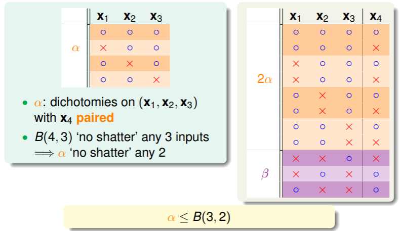 于是将 表示的不能由 3 个子向量 shatter 的问题 缩小 为在 3 个输入中不能被 3 个长度的子向量 shatter 的问题,即 ; - 更进一步地, 表示对成对的 来说,在输入样本 上 dichotomies 的数量,