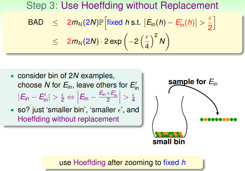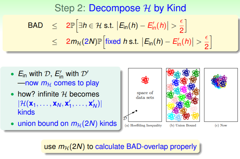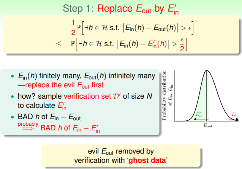 这个关系式由 Vapnik-Chervonenkis 发现,于是命名为 VC-bound 公式,其证明步骤比较麻烦,总的来说可以分成三步:
