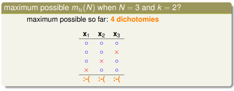 其中橙色部分是两两有 3 个元素完全相同的,而紫色部分则没有; - 记 ,其中 表示 3 个输入样本 时 dichotomies 的数量,