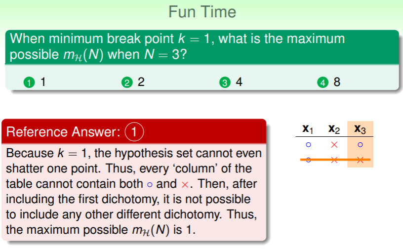 来讨论这样的情形:当 minimum break point 时,意味着任意两个输入样本,都不能被假设集 完全 shatter,