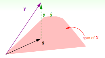 - 预测向量的计算为 ,在线性回归算法运行之前, 可能是任何一个值,而 的意义是对输入矩阵 的所有列分别乘一个特定权值,从而得到由 的列向量组成的一种线性组合,因此 必然属于 的列向量空间;(这在线性代数中称为 span of columns )