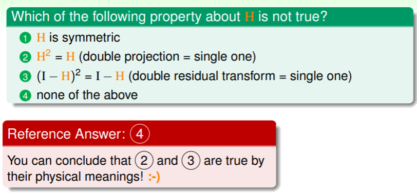 ,这里我们将 称为 Hat Matrix,记作 ,它的作用是将 变为 。(这里 矩阵其实就是单位矩阵,不过国内教科书里通常记作 ,但在国外教科书里都记作 ,因为 identity 这个名称的含义就是“单位”)