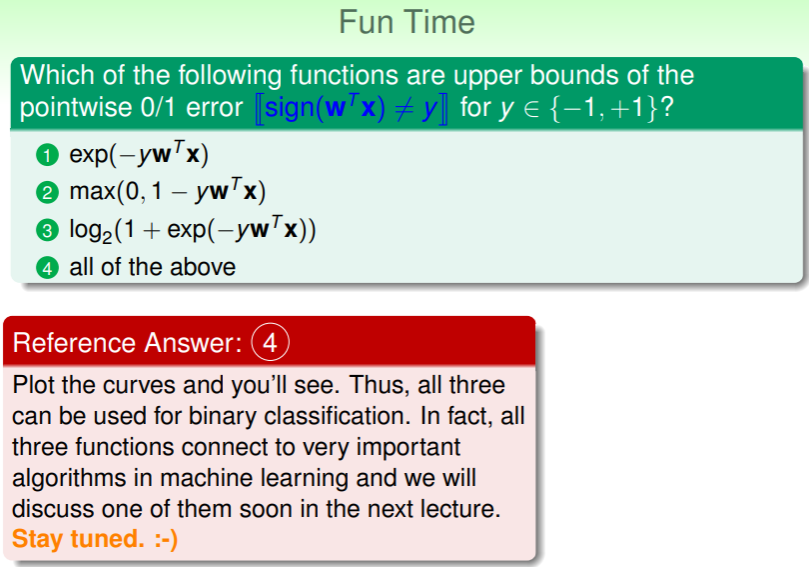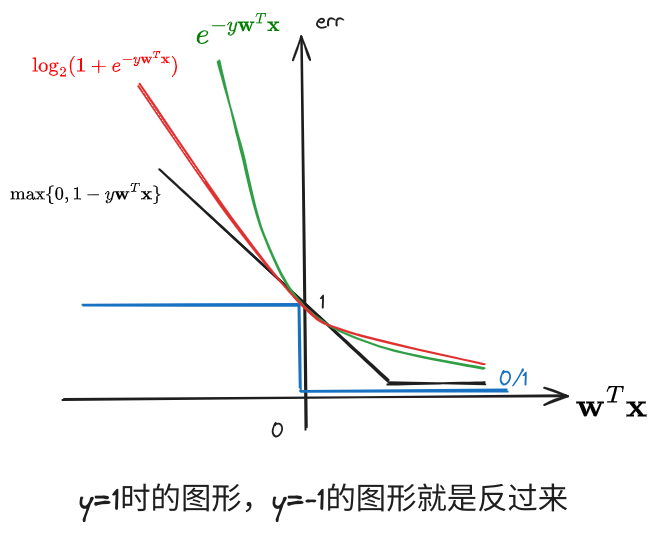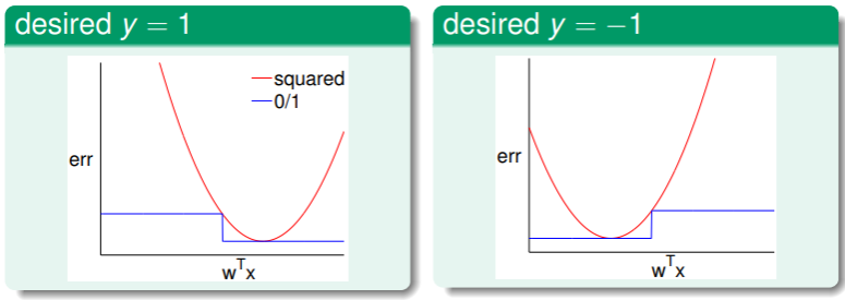 - 二元分类的错误评估是 ,线性回归的错误评估是 ,他们的函数图像是: