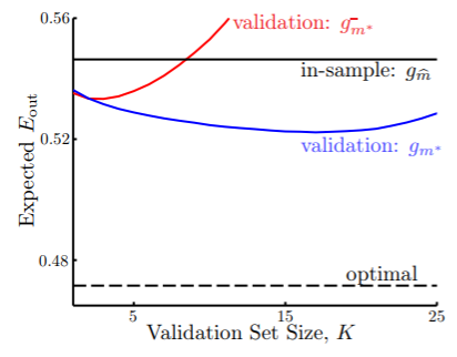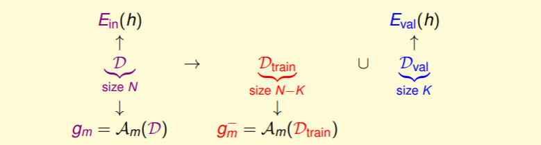 我们最初的思路就是从原来规模为 N 的数据集 中通过学习算法 学习到最佳估计 ,其能够满足最小的 。现在,引入 validation 后,我们将数据集一分为二,其中一份是用于验证的规模为 K 的验证集 ,另一份是规模为 的训练集 :