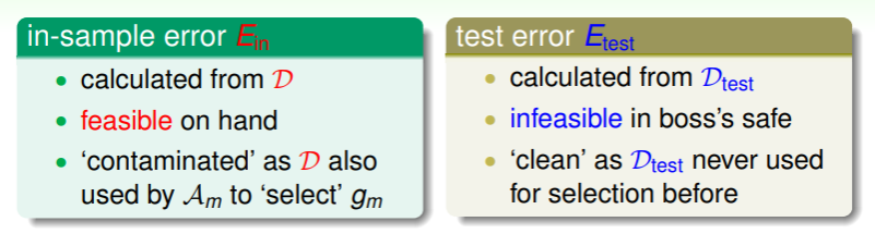 - 这里 in-sample 的假设 是用整个数据集 得到的,而 optimal 是理想的验证集(考试真题),因此它是不可获得的、但效果最好的;