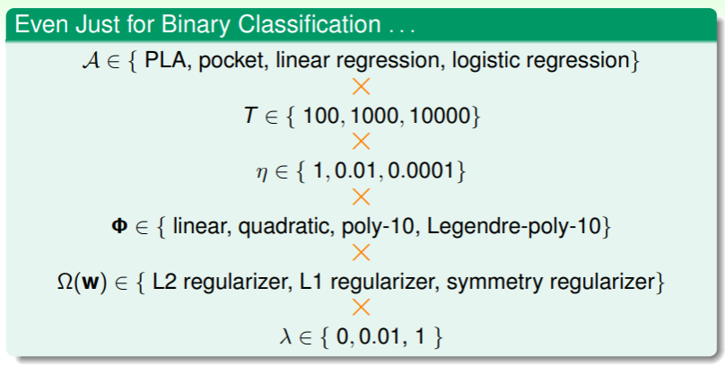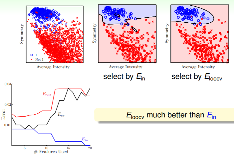 因此我们在选取合适的假设时,应当是从训练集上完成训练的模型里,通过验证集逐一验证,取错误率最低者为 selected model :