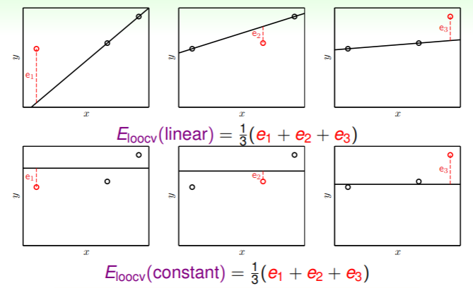 - 上面的流程就称作 Leave-One-Out Cross Validation ,其错误评估函数为