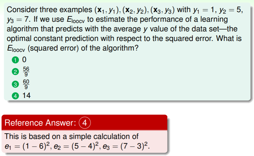 ,因此我们可以说,留一交叉验证法的错误评估与 在期望上相同,这在 ML 中称为 almost unbiased estimate of (即无偏估计)