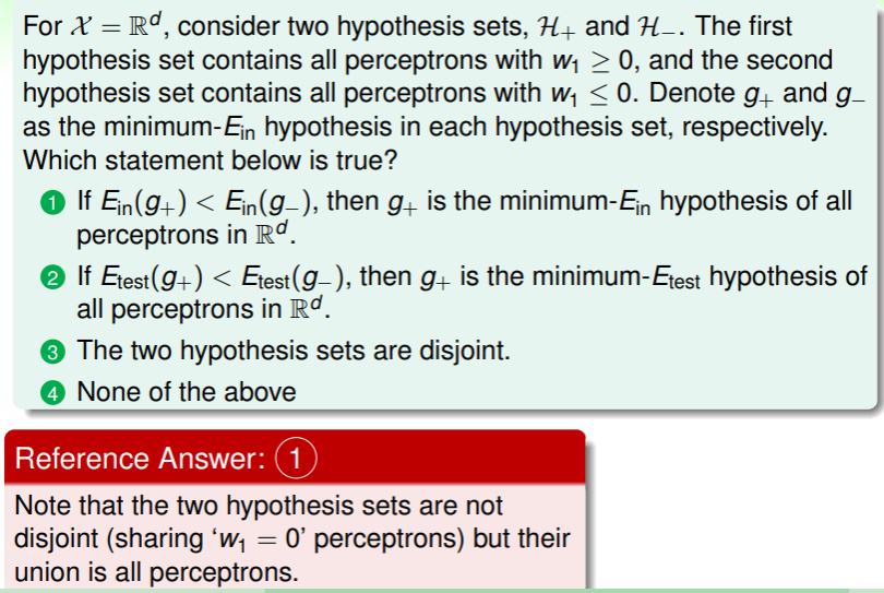 - 另外,如果算法 在假设集 中获得最小的 ,而算法 在假设集 中获得最小的 ,那么要找到 ,就要在两个假设集 中选取,这时 VC dimension 将达到 ,因此复杂度很大,不利于推广;
