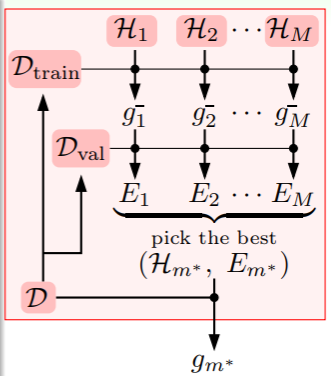 - 不过上图中有一点需要注意,就是在选择错误率最低的假设后,仅是得到了 ,还要在 上再次训练一遍,最后才能得到 ;