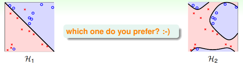 - 我们之前谈论过,高维假设集中获得的假设在 上的表现通常优于低维假设集中的;同样,没有限制(即 )的表现也通常优于有限制时。但是这两种情况都有较大可能导致过拟合问题的发生;