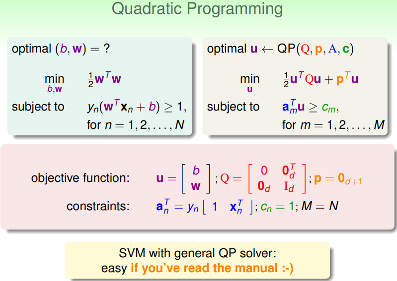 这里 SVM 的数学形式是一个二次函数,参数为 ,其受线性条件约束,条件的参数也是 ,这类问题称为 Quadratic Programming 问题,已有前人做了详尽的实现,我们现在只需要套用: