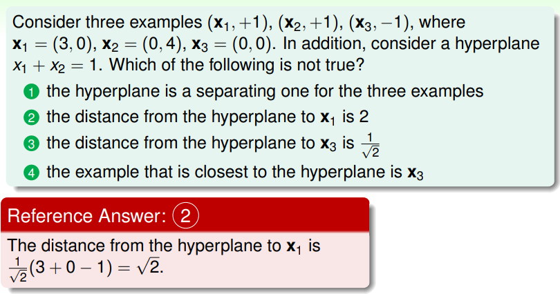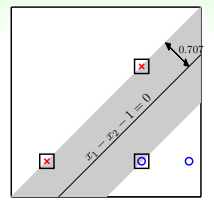 - 在这个特殊情形中,四个样本点中有三个处于边界上,它们到分类器的距离为 :