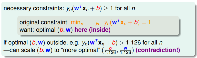 - 在这类问题中只有处于边界上的点才有考虑的价值,因此 ML 中称为 support vector (这里其实只是候选 candidate ,这个会在后续课程解释,这里只需要了解)