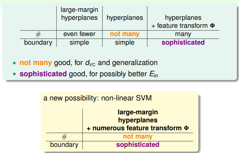 现在我们提出了 SVM ,它能够通过设置 margin 限制数量,又可以保证是线性模型,我们只要在线性 SVM 的基础上引入特征转换,就可以保证数量不会太多,且能适应复杂情况的能力更强: