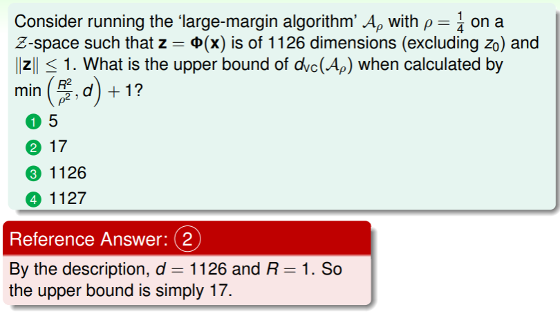 - 显然,当 ,SVM 就退化为 PLA ,而 PLA 可以 shatter 的样本数与维度的关系 是 :