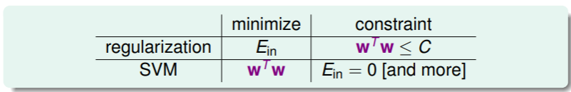 联系之前学习的 正则化 和现在的 SVM ,我们从它们命题中的限制与最小化的目标考量,可以做如下对比: