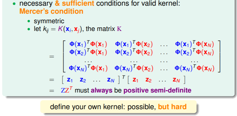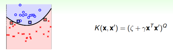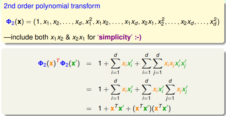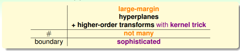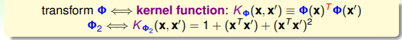 - 回顾我们学习 ML 模型的过程,先是学习了 hyperplane,然后为了应对非线性情形,我们引入了特征转换,现在我们通过 kernel trick ,可以更高效地实现特征转换,即可以不必找到确切的转换函数 ,而是找到对应的 kernel function 即可: ;