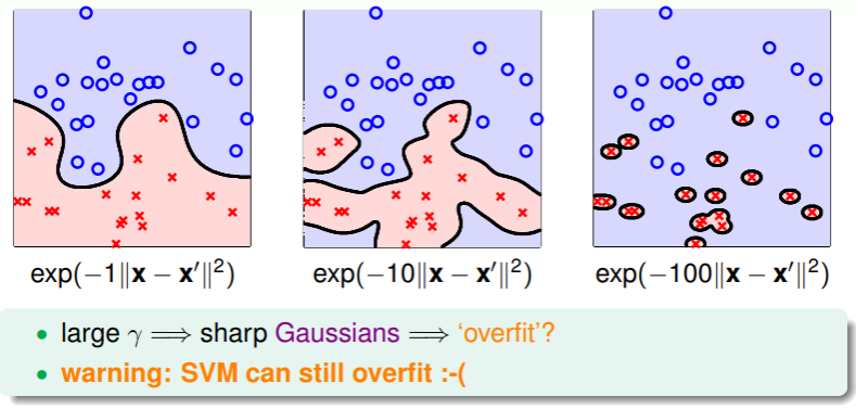 于是,通过 Gaussian SVM ,我们可以实现无穷多维的分类,并且通过 large margin ,可以实现对这种模型可用性的确保。不过事情显然还没结束,我们对 Gaussian Kernel 中的假设有一个关键参数 ,它会如何影响模型呢?