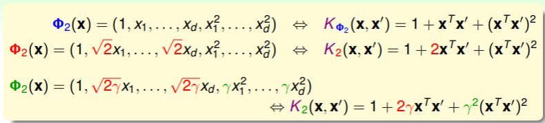 进一步地在不同空间中推广 kernel function ,并且特征转换函数 有两个特殊的参数: ,这两个参数体现在 kernel function 中如下: