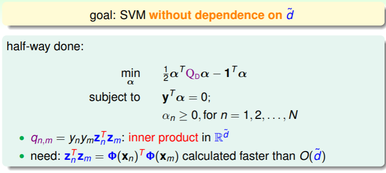 上节课我们通过提出 SVM 的对偶模型 Dual SVM ,实现了对空间维数 依赖的减少,但 并没有完全祛除 :