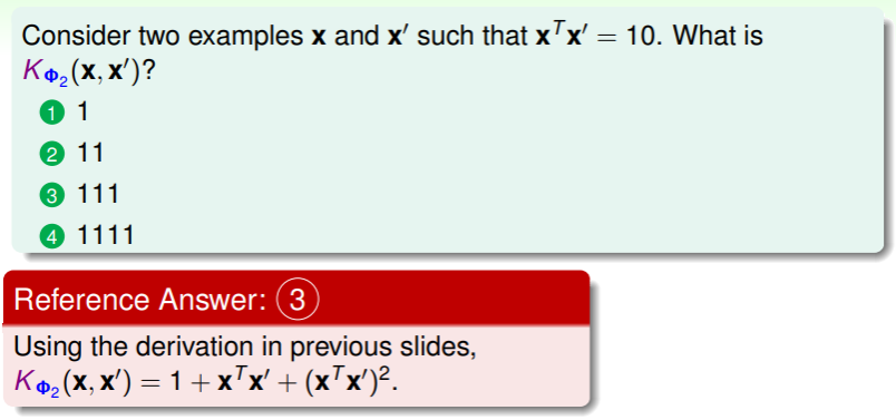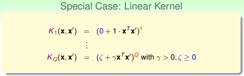 - 对于一维转换的 kernel function ,只需要用到向量内积,因此其又称作 linear kernel ,它的重要性在于我们的原则——从简单的线性模型做起,逐步提高复杂程度,避免过拟合风险;