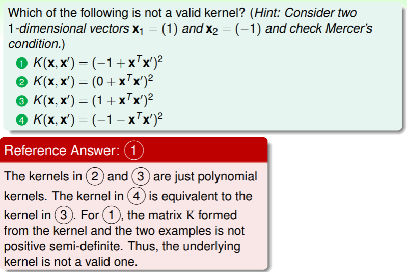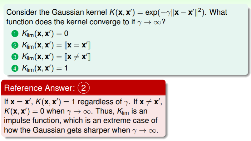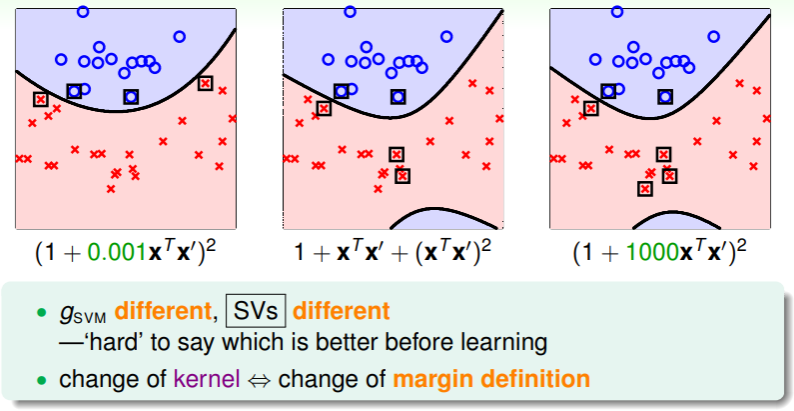 - 因此选择 kernel function 也是同特征转换 一样值得细细考量的事情;