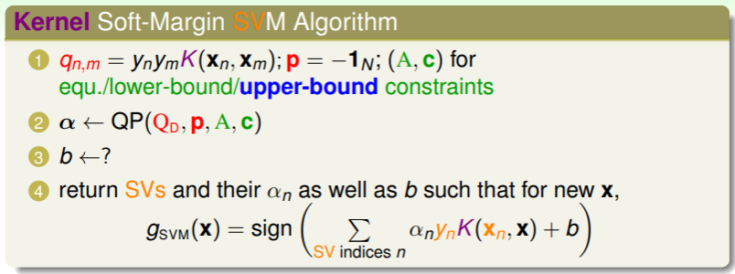 得到对偶 soft-margin SVM 后,我们就能照例引入 kernel function 来进一步祛除对 的依赖,现在 kernel soft-margin SVM 的计算流程如下: