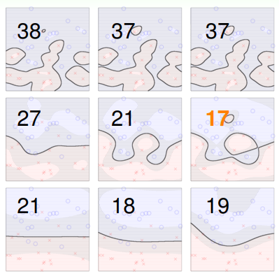 - 显然,支撑向量的实际数量 也并不是一个平滑函数,并且在查看过所有样本点外无法完全确定;