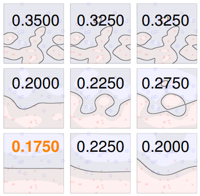 - 我们能够进行选择的依据,就是之前学习过的 交叉验证 ,不过在 SVM 中,交叉验证的犯错率 并不是平滑的、易求解最小值的函数,通常只能尝试不同的 的组合来试探:下图是用 V-Fold 交叉验证计算的各组合结果,则其最小者为目标模型即可