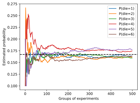 每条实线对应于骰子的6个值中的一个,并给出骰子在每组实验后出现值的估计概率。当我们通过更多的实验获得更多的数据时,这 条实体曲线向真实概率收敛。
