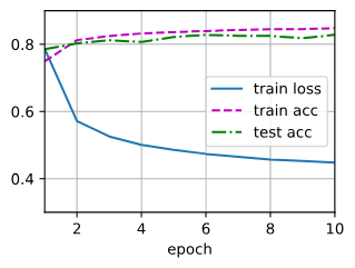 在这里,我们使用学习率为0.1的小批量随机梯度下降作为优化算法。这与我们在线性回归例子中的相同,这说明了优化器的普适性。