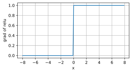 d2l.plot(x.detach(), x.grad, 'x', 'grad of relu', figsize=(5, 2.5))