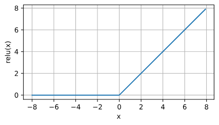 d2l.plot(x.detach(), y.detach(), 'x', 'relu(x)', figsize=(5, 2.5))