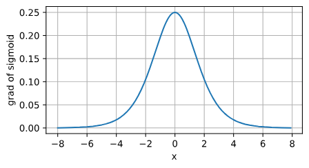 d2l.plot(x.detach(), x.grad, 'x', 'grad of sigmoid', figsize=(5, 2.5))