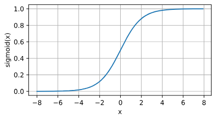 下面,我们绘制 sigmoid 函数。注意,当输入接近0时,sigmoid 函数接近线性变换。