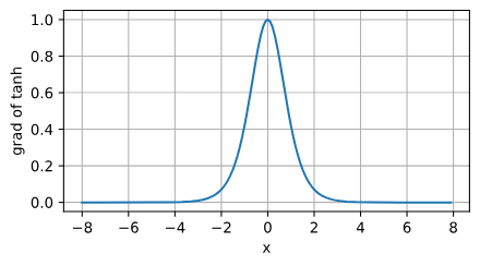 d2l.plot(x.detach(), x.grad, 'x', 'grad of tanh', figsize=(5, 2.5))