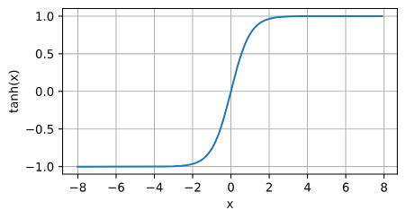 d2l.plot(x.detach(), y.detach(), 'x', 'tanh(x)', figsize=(5, 2.5))