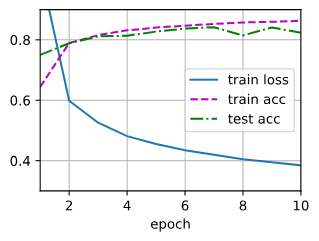 幸运的是,多层感知机的训练过程与 softmax 回归的训练过程完全相同。可以直接调用 d2l 包的 train_ch3 函数(参见 2.6 节 ),将迭代周期数设置为10,并将学习率设置为0.1。