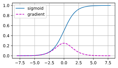 legend=['sigmoid', 'gradient'], figsize=(4.5, 2.5))Output