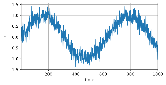 d2l.plot(time, [x], 'time', 'x', xlim=[1, 1000], figsize=(6, 3))