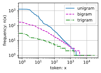 这告诉我们想要通过计数统计和平滑来建模单词是不可行的,因为这样建模的结果会大大高估尾部单词的频率,也就是所谓的不常用单词。那么其他的词元组合,比如二元语法、三元语法等等,又会如何呢?我们来看看二元语法的频率是否与一元语法的频率表现出相同的行为方式。
