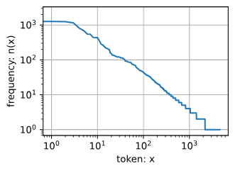 通过此图我们可以发现:词频以一种明确的方式迅速衰减。将前几个单词作为例外消除后,剩余的所有单词大致遵循双对数坐标图上的一条直线。这意味着单词的频率满足齐普夫定律(Zipf’s law),即第 个最常用单词的频率 为: