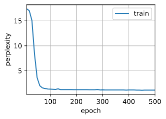 d2l.train_ch8(model, train_iter, vocab, lr, num_epochs, device)perplexity 1.1, 128668.4 tokens/sec on cuda:0