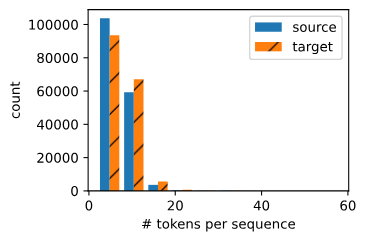 source[:6], target[:6]让我们绘制每个文本序列所包含的词元数量的直方图。在这个简单的“英-法”数据集中,大多数文本序列的词元数量少于个。