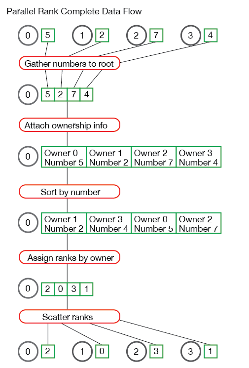 - 当进程 A 需向进程 B 发送消息时,其首先将数据打包至缓冲区(类似于信封),后通过网络路由至 B(根据 rank 确定)。