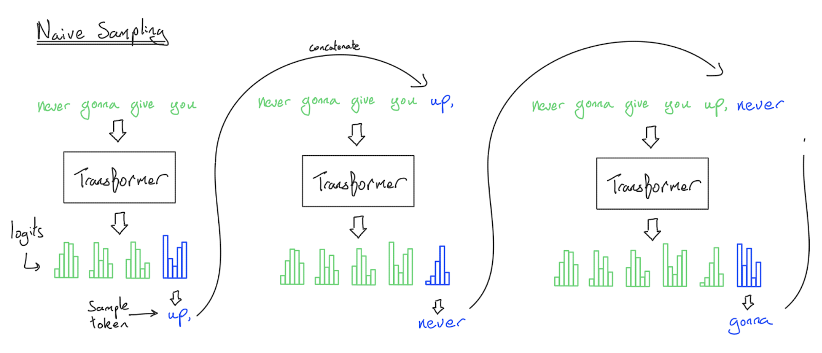 上图是从 Transformer 中采样的 naive 实现。蓝色的 logits 给出一个下一 token 的分布,从而用于采样。注意每一步都需要重新处理整个前缀(包括 input prompt+generated tokens),导致算法的运行时间为 。